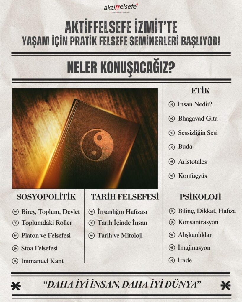 Yer: Aktiffelsefe İzmit – Yenişehir Mah. Gazi Mustafa Kemal Bulvarı No:139/2 İzmit-KOCAELİ (Yenişehir Tramvay durağından ulaşım sağlanabilir. İletişim için Whatsapp: 05382462946 )